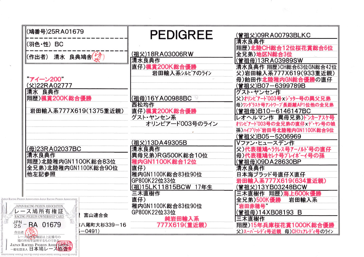 出品鳩若69番「25RA01679 BC」清水良典作アイーン200号岩田輸入系(777×619)1375重近親楓賞200K総合優勝×岩田系北陸稚内GN1100k総合83位鳩 ![]() |