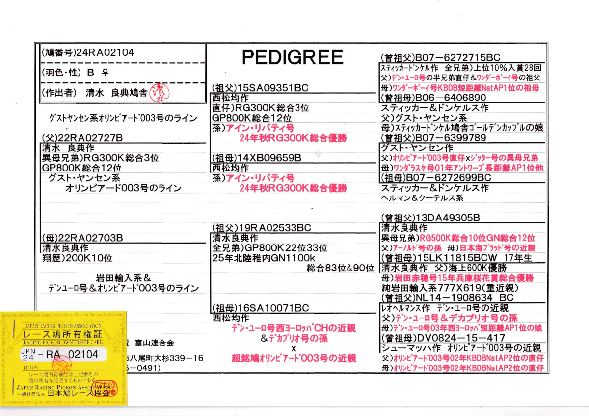 出品鳩♀60番「24RA02104 B♀」清水作半兄弟)GP800K総合12位(銘鳩オリンピアード003号)×200k10位(北陸GN1100K総合90位×オリンピアード003号近親) ![]() |