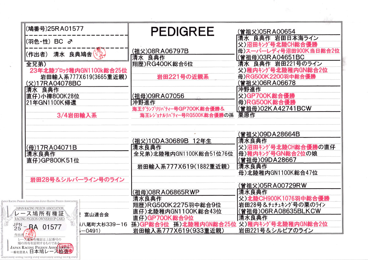 出品鳩若4番「25RA01577 BC」清水良典作全兄弟)23年北陸GN1100K総合25位半兄弟)小樽800K28位鳩GP800k51位 岩田輸入系(777×619)3665重近親 ![]() |