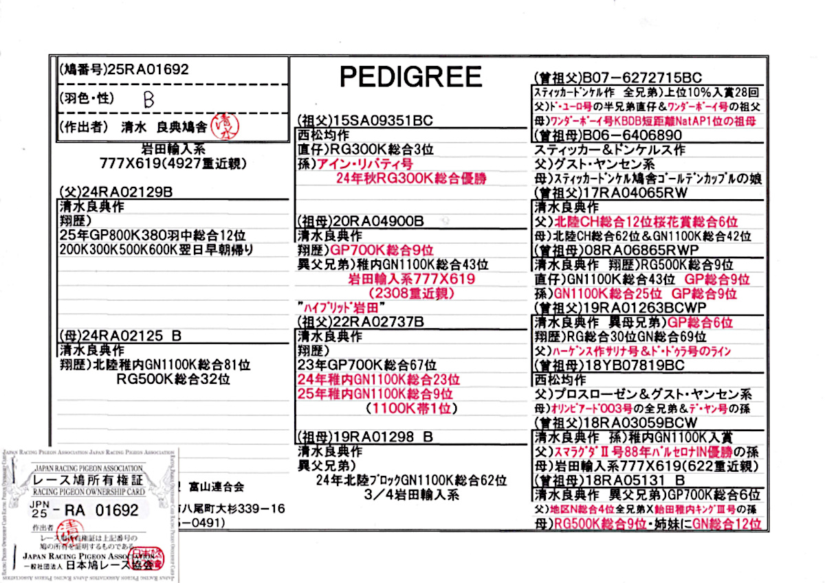 出品鳩若82番「25RA01692 B」清水良典作北陸GP総合12位&岩田(777×619)2308重近親×北陸GN総合81位岩田(777×619)2619重近親 ハイブリット岩田号孫鳩 ![]() |