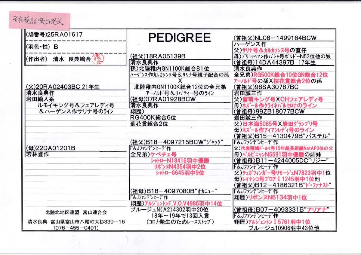 出品鳩リスト外「25RA01617 B」清水良典鳩舎作 RG400K総合6位菊花賞総合2位(両親岩田作)直仔×若林作両親ファンデンヒーデ作(シャトローN総合優勝全兄弟×アルジェントン4986羽14位ブールジュ4302羽20位)娘鳩 との直仔です。 父親 ♂31番21年生「20RA02403 BC ♂」清水良典鳩舎作(カルカソンヌ号・銘鳩サリナ号親娘配合孫×北陸稚内GN1100K総合12位全兄弟)直仔×RG400K総合6位菊花賞総合2位鳩(両親岩田作)との直仔です。 母親 ♀44番「22DA01201 B ♀」若林 登鳩舎作 両親F&J・ファンデンヒーデ鳩舎作ケペチェ号シャトローN18416羽総合優勝の全兄弟×アルジェントン4986羽14位 ブールジュ4302羽20位(ド・ファナスト号リボンヌN6134羽総合優勝の娘)鳩 との直仔です。 詳しくは、血統書を参照してください。 ※当該鳩の「所有権証」は清水氏は現在娘さんの家で生活をしているために実家に戻ってからの発送のため後送となります。 <備考> 現在管理人の鳩舎で元気に暮らしています。写真4/2日に撮影しました。 菅原明鳩舎の概要はこちらをご覧ください |