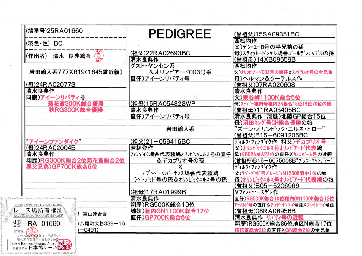 出品鳩若51番「25RA01660 BC」清水良典作アイーンリバティ号秋RG総合優勝菊花賞総合優勝の同腹×アィーンファンダイク号24年秋RG総合2位菊花賞総合2位鳩 ![]() |