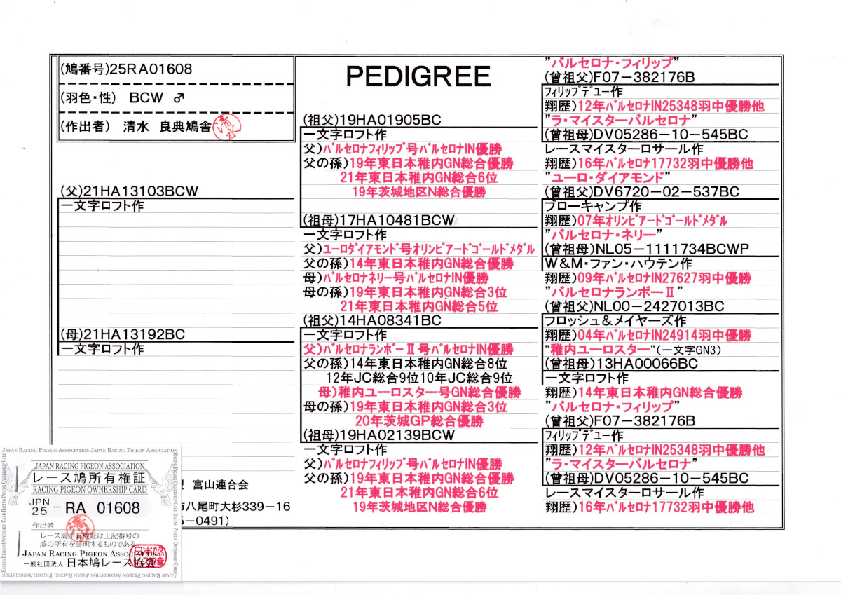 出品鳩若19番「25RA01608 BCW」清水作(フィリップス&ラ・マイスター直仔×ユーロ&ネリー娘)×(ランボーU&稚内ユーロスター直仔×フィリップス号娘) ![]() |
