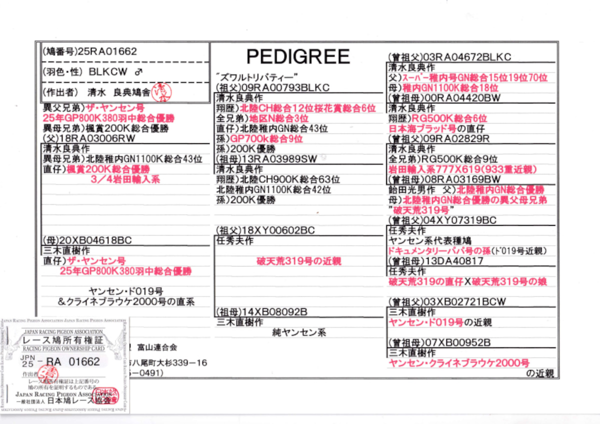 出品鳩若53番「25RA01662BLKCW」清水作半兄弟)ザヤンセン号北陸GP総合優勝アイーン200号楓賞総合優勝岩田(777×619)1375重近親×(破天荒ヤンセン×純ヤンセン系) ![]() |