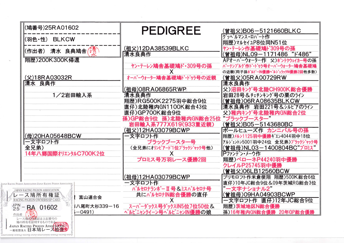 出品鳩若15番「25RA01602 BLKCW」清水作北陸GN総合43位GP総合9位半兄弟(ヤンテーレン系オーバーウォーター系XRG総合9位)×八郷オリエンタルC700K2位全兄弟 ![]() |