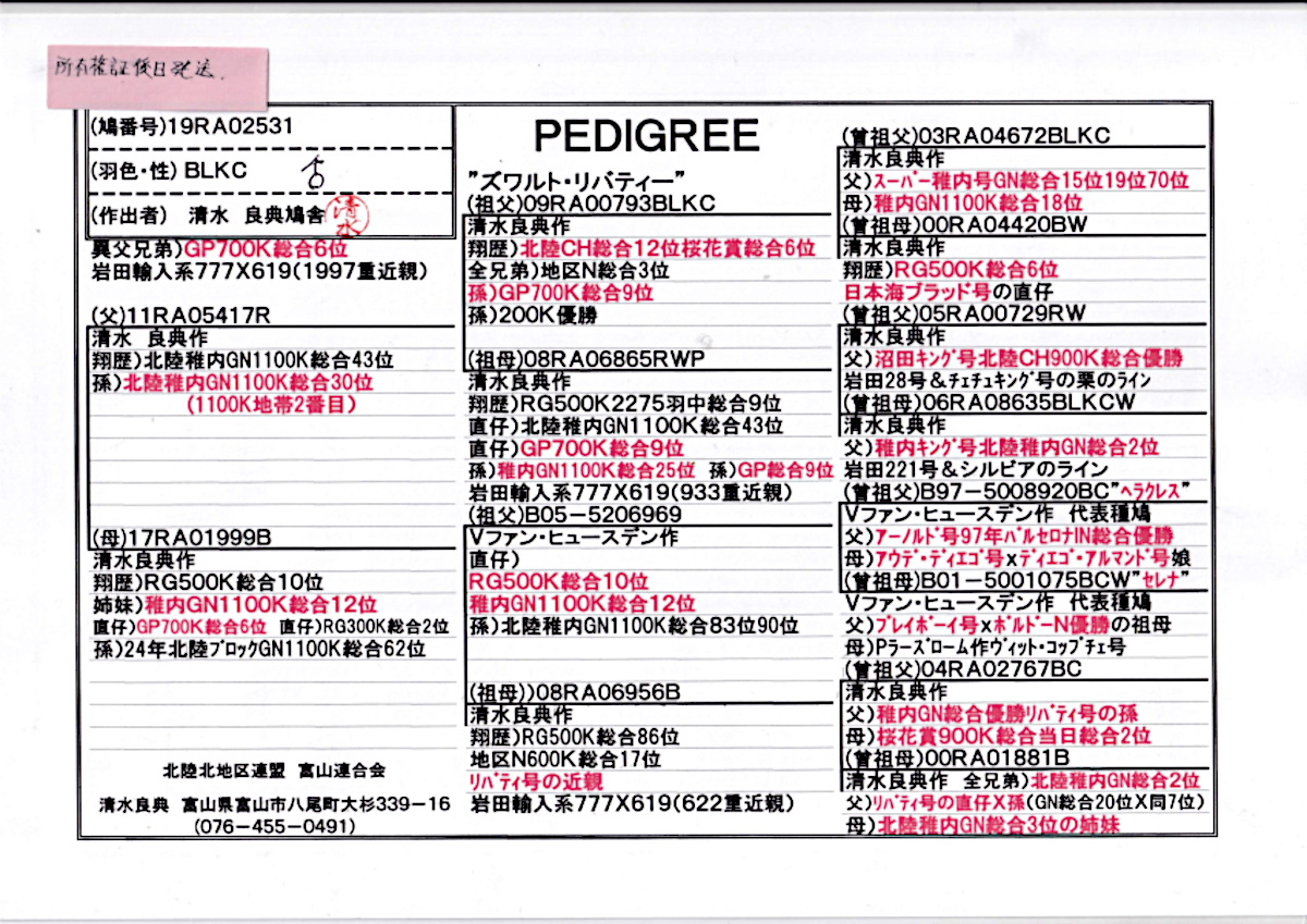 出品鳩リスト外「19RA02531 BLKC♂」清水良典作半兄弟)RG総合2位鳩GP総合6位鳩 北陸GN総合43位(ズワルト・リバティ号直仔)×RG総合10位(兄弟GN総合12位) ![]() |