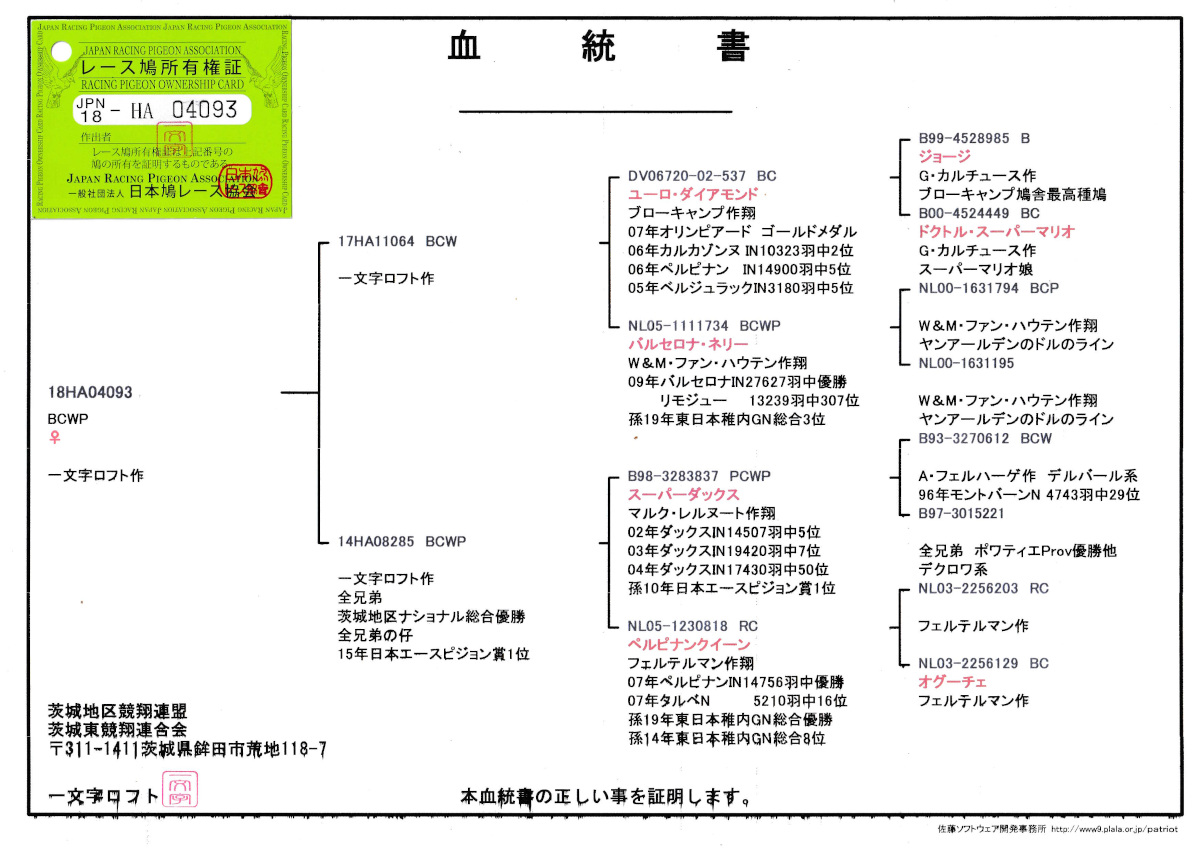 出品鳩「18HA04093 BCWP♀」一文字作(ユーロ・ダイヤモンド号×バルセロナ・ネリー号)×地区N総合優勝全兄弟(スーパーダックス号×ペルピナンクィーン号) ![]() |