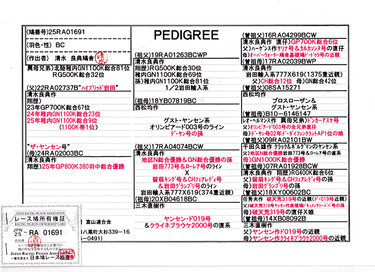 出品鳩若81番「25RA01691 BC」清水良典鳩舎作半兄弟)北陸GN1100K総合81位 ハイブリッド岩田号北陸稚内GN総合9位総合23位×ザヤンセン号北陸GP800k総合優勝鳩 ![]() |