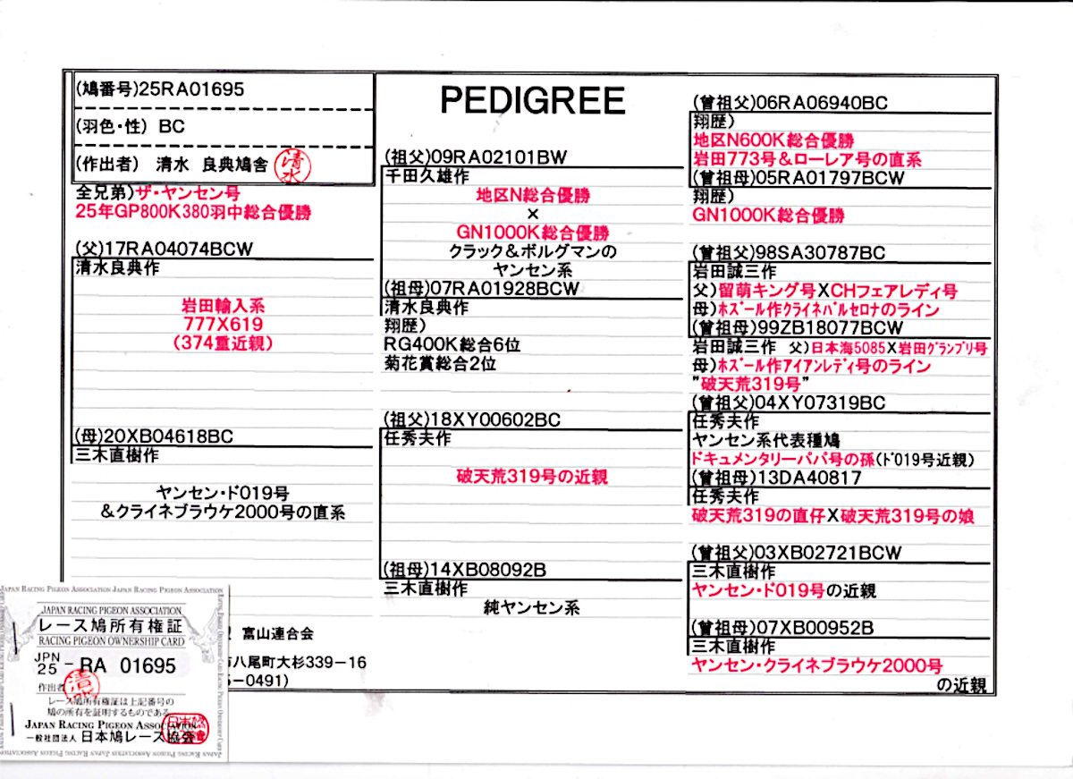 出品鳩若85番「25RA01695 BC」清水良典鳩舎作 "ザ・ヤンセン号"25年北陸GP800K380羽中総合優勝鳩の全兄弟鳩 ![]() |