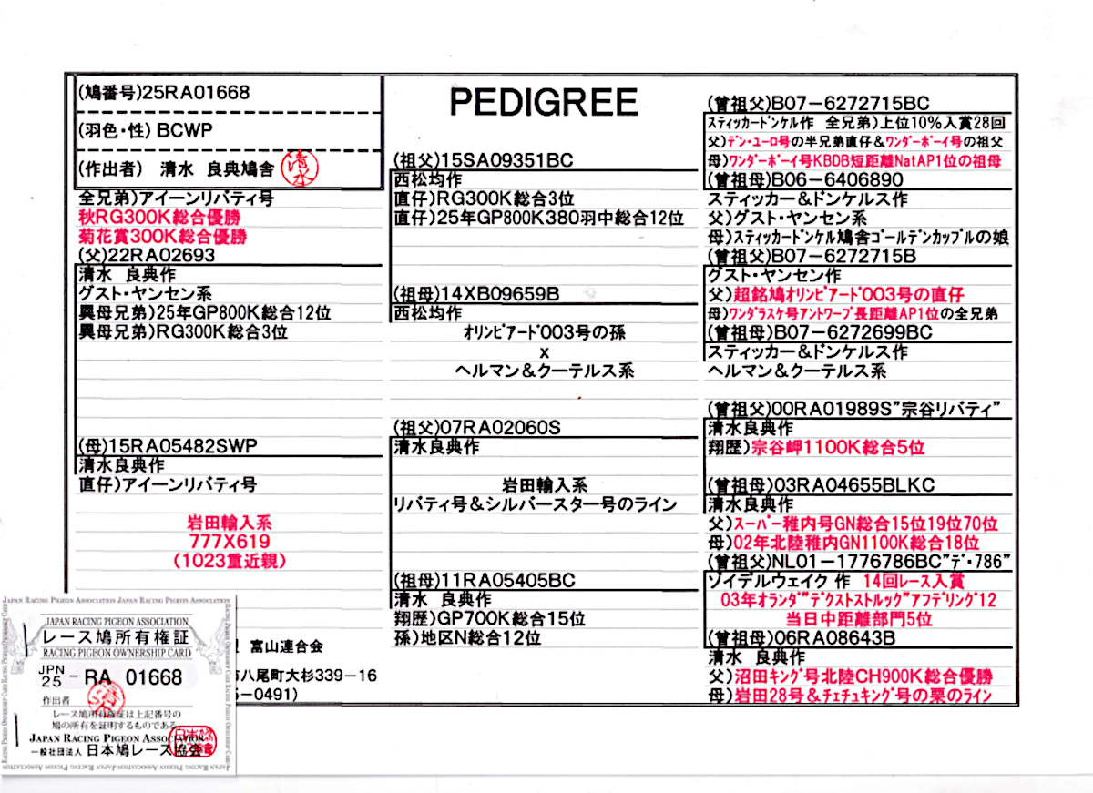 出品鳩若58番「25RA01668 BCWP」清水良典鳩舎作 アイーンリバティ号24年秋RG300K総合優勝菊花賞300K総合優勝の全兄弟鳩で グスト・ヤンセン系×岩田輸入系(777×619)1023重近親鳩 との直仔です。 父親 ♂36番「22RA02693 BCW ♂」清水良典鳩舎作直仔にアインリバティ号24年秋RG300K総合優勝菊花賞総合優勝 異母兄弟に 25年北陸GP800K380羽中総合12位 RG300K総合3位鳩がいる 両親ドンケルス作上位10%入賞28回中距離AP3位全兄弟の直仔 ×グストヤンセン作銘鳩オリンピアード0003号ライン鳩 との直仔です。 母親 ♀13番「15RA05482 SWP ♀」清水良典鳩舎作直仔にアインリバティ号24年秋RG300K総合優勝菊花賞総合優勝鳩がいる 岩田輸入系(777×619)1023重近親鳩(宗谷リバティ号1100K総合5位Xスーパー稚内号北陸GN1100K総合15位19位70位の娘直仔×GP700K総合15位(オランダ地方当日AP中距離部門5位×沼田キング号北陸CH総合優勝の娘)鳩 との直仔です。 詳しくは、血統書を参照してください。 <備考> 現在管理人の鳩舎で元気に暮らしています。写真4/9日に撮影しました。 菅原明鳩舎の概要はこちらをご覧ください |