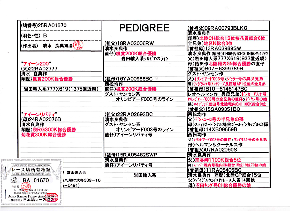 出品鳩若60番「25RA01670 B」清水良典作アイーン200号楓賞総合優勝岩田(777×619)1375近親×アイーンリバティ号秋RG&菊花賞総合優勝岩田(777×619)1023近親 ![]() |