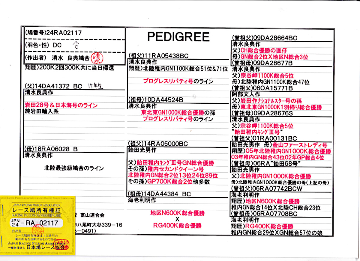 出品鳩リスト外「24RA02117 DC♂」清水良典作岩田系北陸稚内GN1100K総合51位76位直仔×北陸飛筋(飴田稚内キングV号直仔×海老作PN&RG総合優勝娘) ![]() |