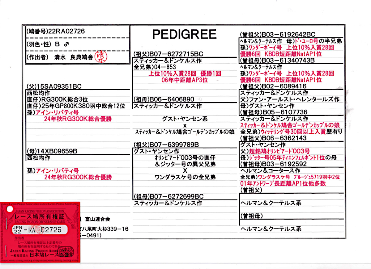 出品鳩♂37番「22RA02726 B♂」清水良典作直仔)秋RG&菊花賞総合優勝半兄弟)北陸GP総合12位RG総合3位両親ドンケルス作×グストヤンセン系オリンピアード003号系 ![]() |