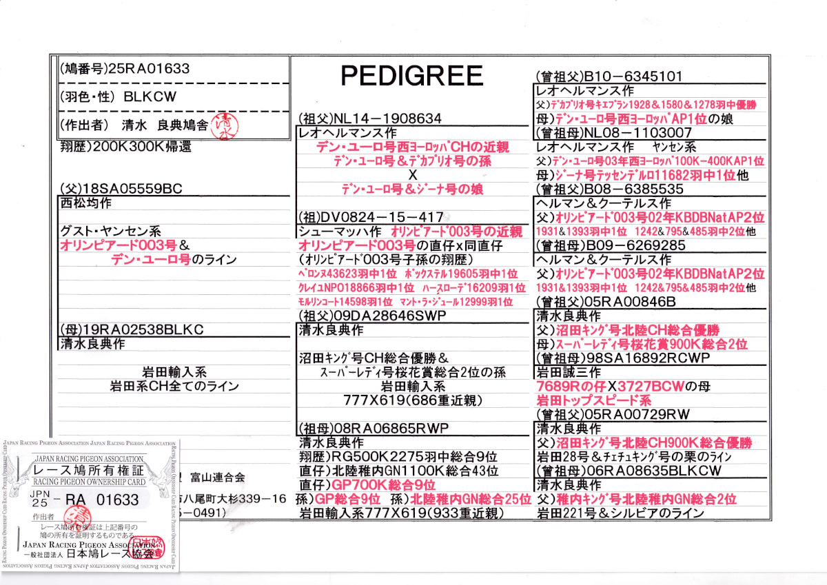 出品鳩若36番「25RA01633BLKCW」清水良典作翔300K迄半兄弟)200K総合4位 西村作(デンユーロ号号孫×オリンピアード003号近親孫)×岩田輸入系(777×619)1619重近親 ![]() |