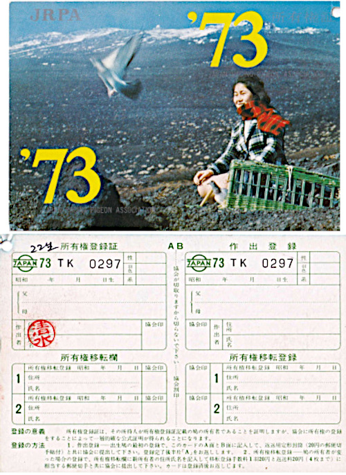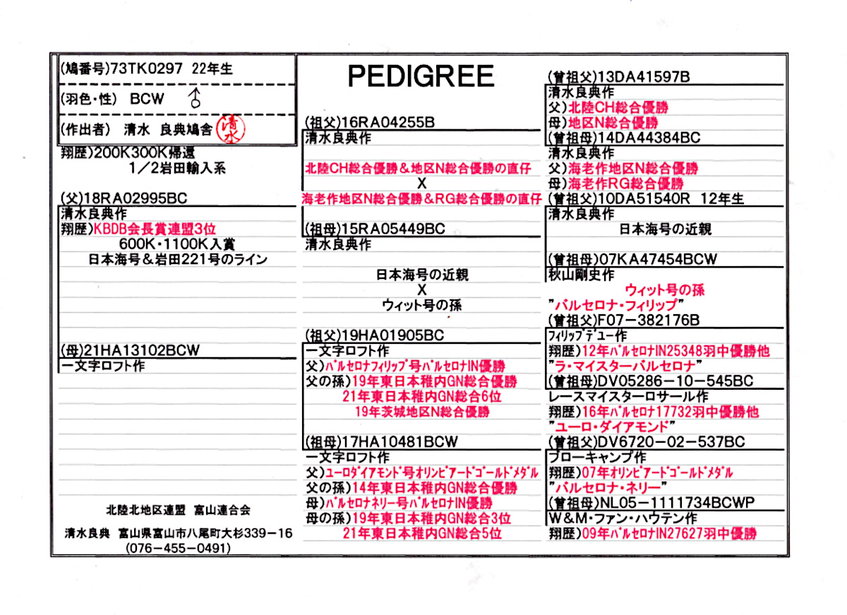 出品鳩♂7番22年生「73TK0297 BCW♂」清水作翔300k迄岩田日本海号岩田221号系KBDB会長賞連盟3位×一文字作フイリップス&ラマイスター&ユーロ&ネリー号孫鳩 ![]() |