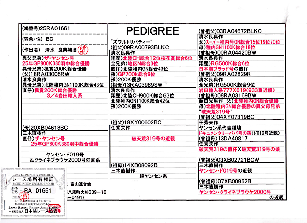 出品鳩若52番「25RA01661 BC」清水作半兄弟)ザヤンセン号北陸GP総合優勝アイーン200号楓賞総合優勝岩田(777×619)1375重近親×(破天荒ヤンセン×純ヤンセン系) ![]() |