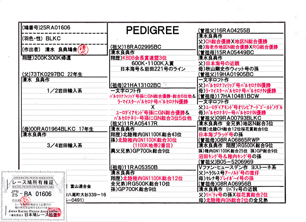 出品鳩若18番「25RA01606 BLKC」清水作(KBDB会長賞連盟3位×フイリップ&ラマイスター&ユーロ&ネリー孫)×岩田(777×619)1987近親(GN総合43位×GN総合12位) ![]() |