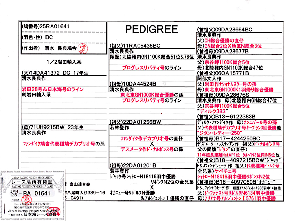 出品鳩若40番「25RA01641 BCW」清水良典鳩舎作岩田輸入系北陸稚内GN1100K総合51位76位の直仔×両親若林作(ファンダイク作デカプリオ号孫×両親ファンデンヒーデ作(ケペチェ号シャトローN18416羽総合優勝の全兄弟の娘鳩 との直仔です。 父親 ♂8番17年生「14DA41372 BC ♂」清水良典鳩舎作純岩田輸入系北陸稚内GN1100K総合51位76位鳩(宗谷リバティ号宗谷1100K総合5位孫)×(東北東GN総合優勝直仔×宗谷リバティ号宗谷1100K総合5位の娘)娘鳩 との直仔です。 母親 ♀4番23年生「71UH9215 BW ♀」清水良典鳩舎作両親若林作(ファンダイク作代表種鳩デカプリオ号直仔×デズメーター作ジダン号同腹娘)直仔×両親ファンデンヒーデ作(ケペチェ号シャトローN18416羽総合優勝全兄弟×アルジェントン4986羽14位 ブールジュ4302羽20位)娘鳩 との直仔です。 詳しくは、血統書を参照してください。 <備考> 現在管理人の鳩舎で元気に暮らしています。写真4/9日に撮影しました。 菅原明鳩舎の概要はこちらをご覧ください |