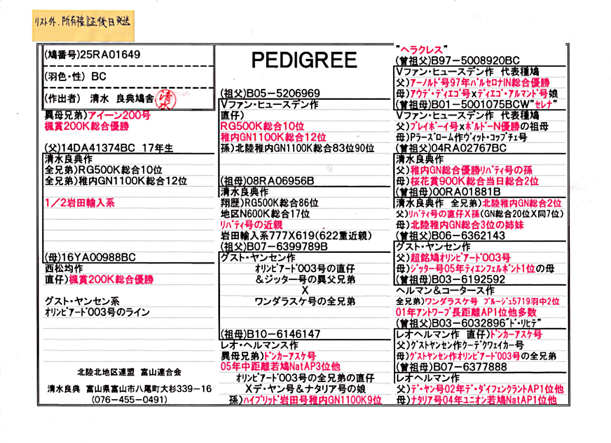 出品鳩リスト外「25RA01649 BC」清水作半兄弟)楓賞総合優勝岩田系稚内GN総合12位全兄弟×(オリンピアード003号孫Xレオヘルマンズ作中距離若鳩NatAP3位半兄弟) ![]() |