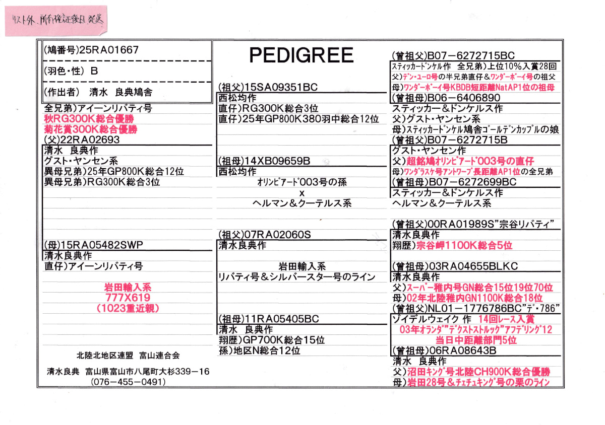 出品鳩リスト外「25RA01667 B」清水良典鳩舎作 アイーンリバティ号24年秋RG300K総合優勝菊花賞300K総合優勝の全兄弟鳩で グスト・ヤンセン系×岩田輸入系(777×619)1023重近親鳩 との直仔です。 父親 ♂36番「22RA02693 BCW ♂」清水良典鳩舎作直仔にアインリバティ号24年秋RG300K総合優勝菊花賞総合優勝 異母兄弟に 25年北陸GP800K380羽中総合12位 RG300K総合3位鳩がいる 両親ドンケルス作上位10%入賞28回中距離AP3位全兄弟の直仔 ×グストヤンセン作銘鳩オリンピアード0003号ライン鳩 との直仔です。 母親 ♀13番「15RA05482 SWP ♀」清水良典鳩舎作直仔にアインリバティ号24年秋RG300K総合優勝菊花賞総合優勝鳩がいる 岩田輸入系(777×619)1023重近親鳩(宗谷リバティ号1100K総合5位Xスーパー稚内号北陸GN1100K総合15位19位70位の娘直仔×GP700K総合15位(オランダ地方当日AP中距離部門5位×沼田キング号北陸CH総合優勝の娘)鳩 との直仔です。 詳しくは、血統書を参照してください。 ※当該鳩の「所有権証」は清水氏は現在娘さんの家で生活をしているために実家に戻ってからの発送のため後送となります <備考> 現在管理人の鳩舎で元気に暮らしています。写真4/9日に撮影しました。 菅原明鳩舎の概要はこちらをご覧ください |