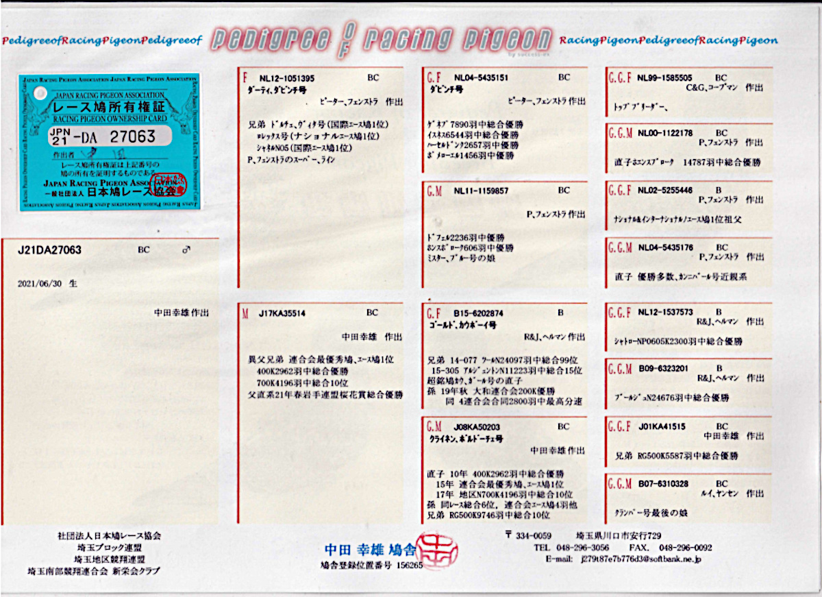 出品鳩「21DA27063 BC♂」中田作 国際AP鳩1位2羽ロレックス号NエースP1位兄弟&ダビンチ号直仔×(カウガール号直仔×クライネン・ボルドーチェ号) ![]() |