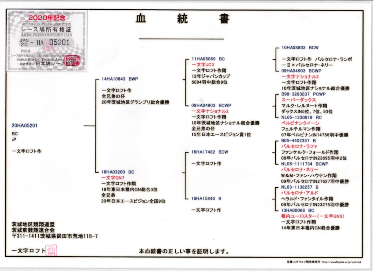 出品鳩「20HA05201 BC♂」一文字作(一文字JC3号JC総合9位 ×一文字ナショナル2号地区N総合優勝)×一文字GN7号東日本GN1106羽当日総合3位 ![]() |