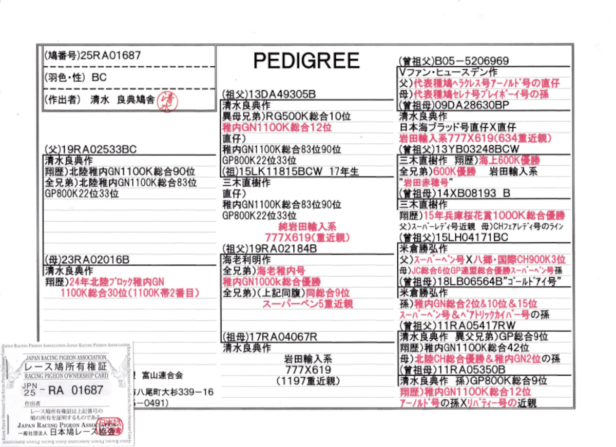 出品鳩若77番「25RA01687 BC」清水良典作岩田輸入系21年北陸稚内GN1100k総合90位鳩×24年北陸稚内GN総合30位&1100k地帯2位 ![]() |