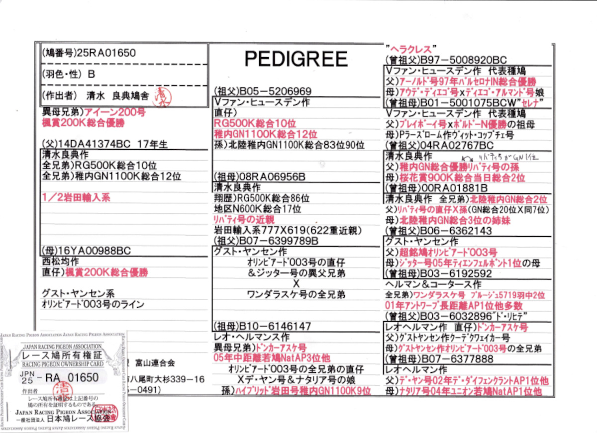 出品鳩若46番「25RA01650 B」清水良典作半兄弟)楓賞総合優勝岩田系稚内GN総合12位全兄弟×(オリンピアード003号孫Xレオヘルマンズ作中距離若鳩NatAP3位半兄弟) ![]() |