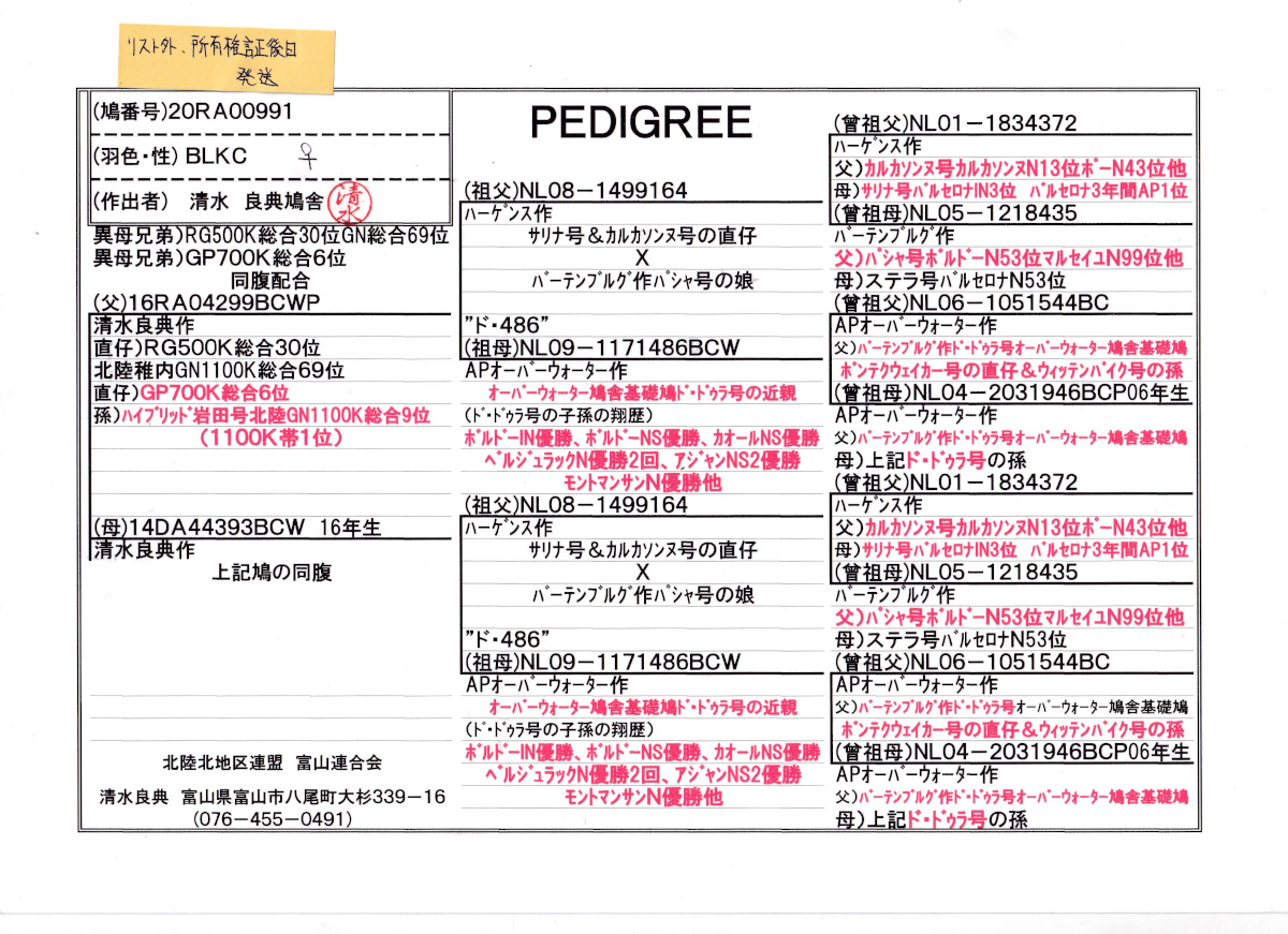 出品鳩リスト外「20RA00991 BLKC♀」清水作半兄弟)北陸GN1100K総合69位GP700K総合6位(サリナ号孫Xオーバーウォーター基礎鳩ド・ドゥラ号近親)直仔の同腹交配 ![]() |