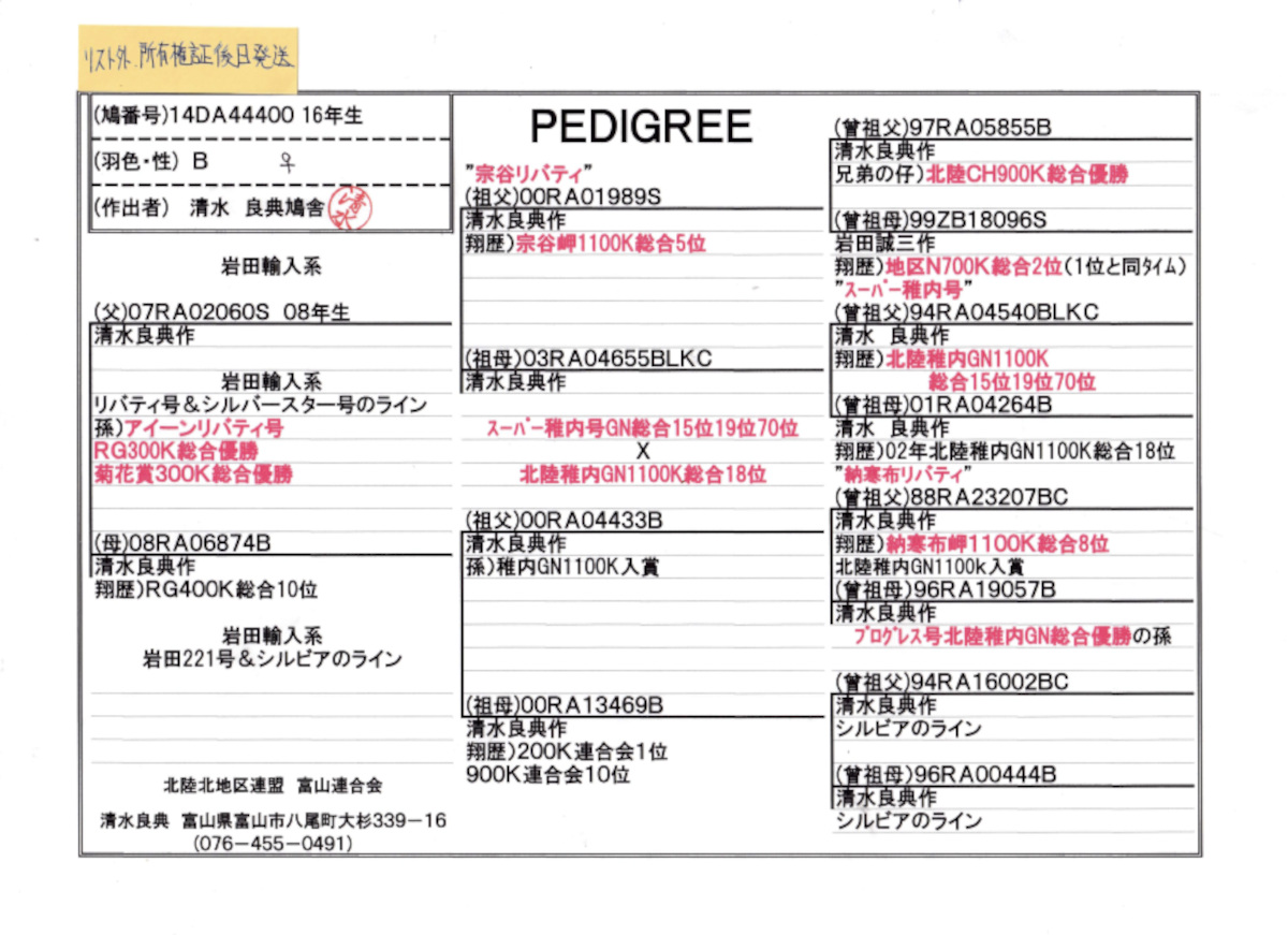 出品鳩リスト外16年生「14DA44400 B♀」清水作岩田系(宗谷岬1100K総合5位Xスーパー稚内号北陸GN総合15位19位70位娘)×RG総合10位(納沙布岬1100k総合8位孫) ![]() |