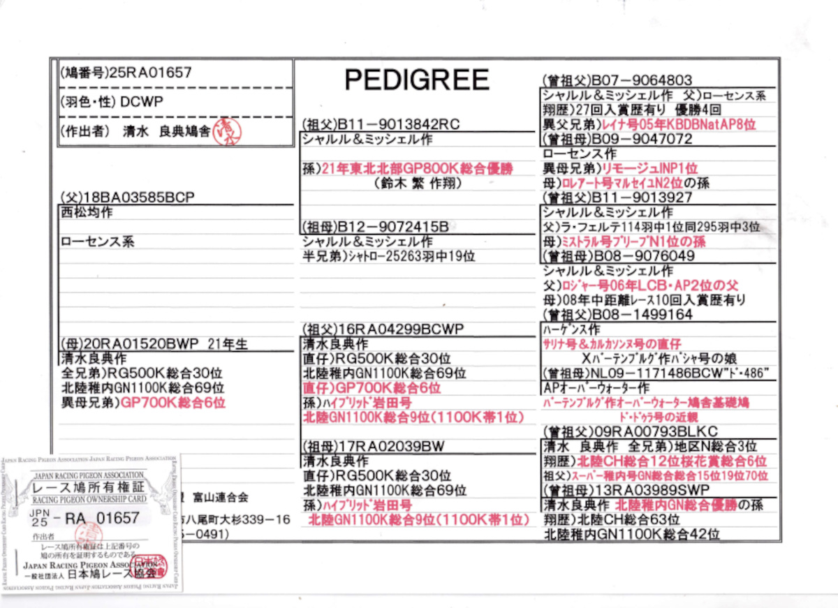 出品鳩若50番「25RA01657 DCWP」清水作西松作両親シャルル&ミッシェル作ローセンス系×GN総合69位全兄弟(サリナ号系X桜花賞総合6位&GN総合42位娘) ![]() |