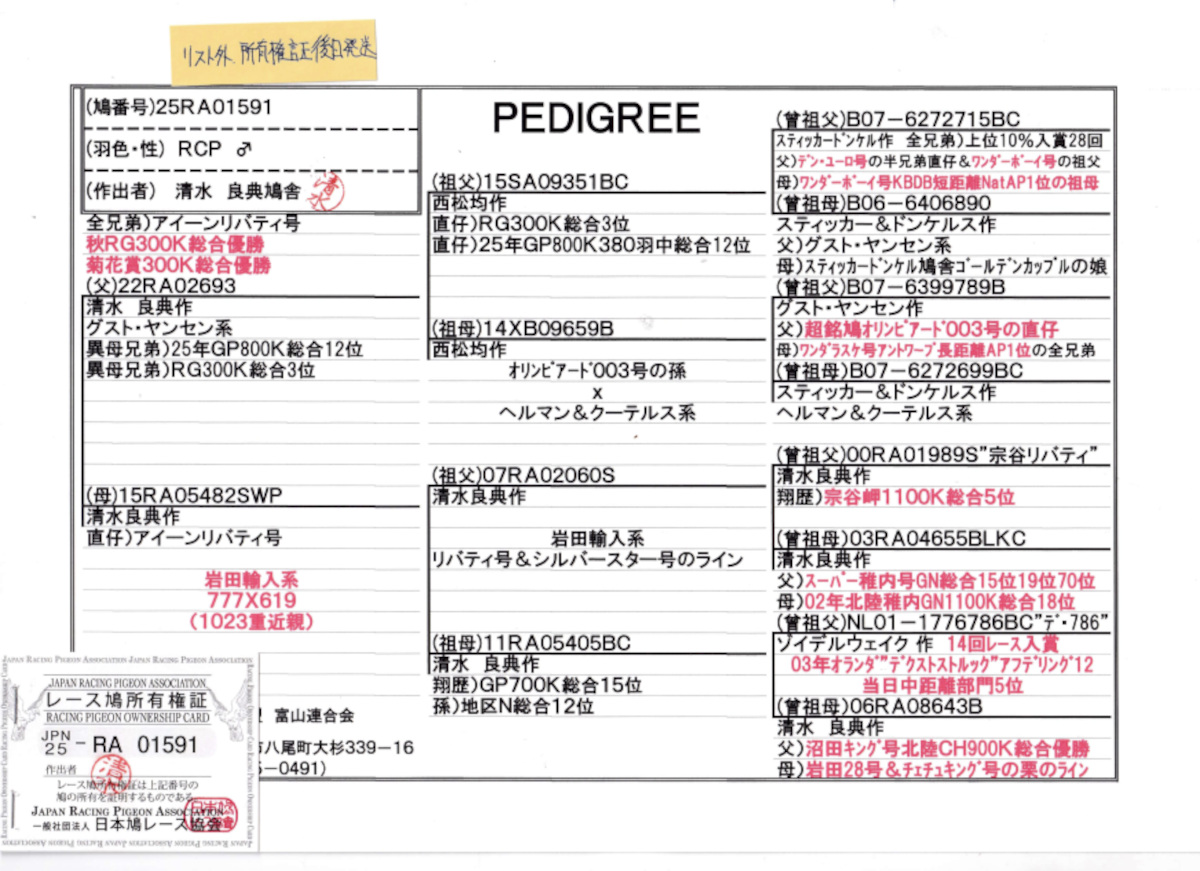 出品鳩リスト外「25RA01591 RCP」清水良典鳩舎作翔 アイーンリバティ号24年秋RG300K総合優勝菊花賞300K総合優勝鳩の全兄弟鳩 ![]() |