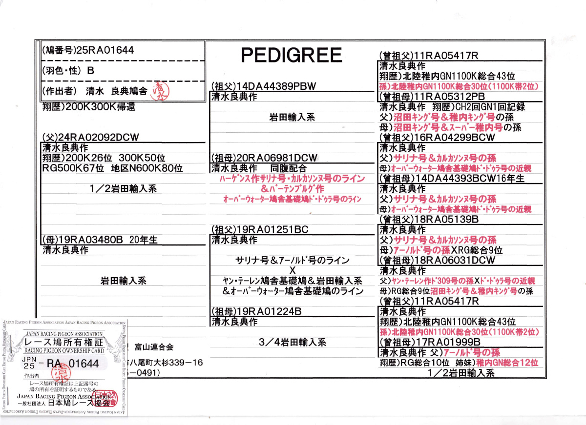 出品鳩若43番「25RA01644 B」清水良典作RG500k67位地区N600K80位(岩田系北陸GN1100K総合43位孫鳩)×岩田系北陸GN1100K総合43位孫鳩 ![]() |