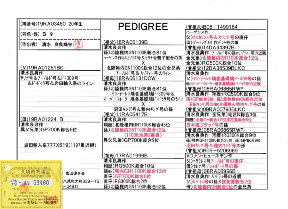 出品鳩♀32番20年生「19RA03480 B♀」清水良典作(稚内GN総合12位全兄弟の直仔Xド・ドゥラ号近親&沼田キング号系)×(GN総合43位XRG総合12位) ![]() |
