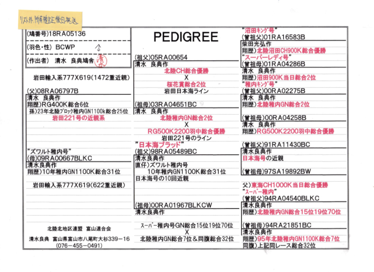 出品鳩リスト外「18RA05136 BCWP♂」清水良典作岩田系(777×619)1472重近親鳩 RG400K総合6位(沼田キング号孫鳩)×ズワルト稚内号北陸GN1100K総合31位 ![]() |