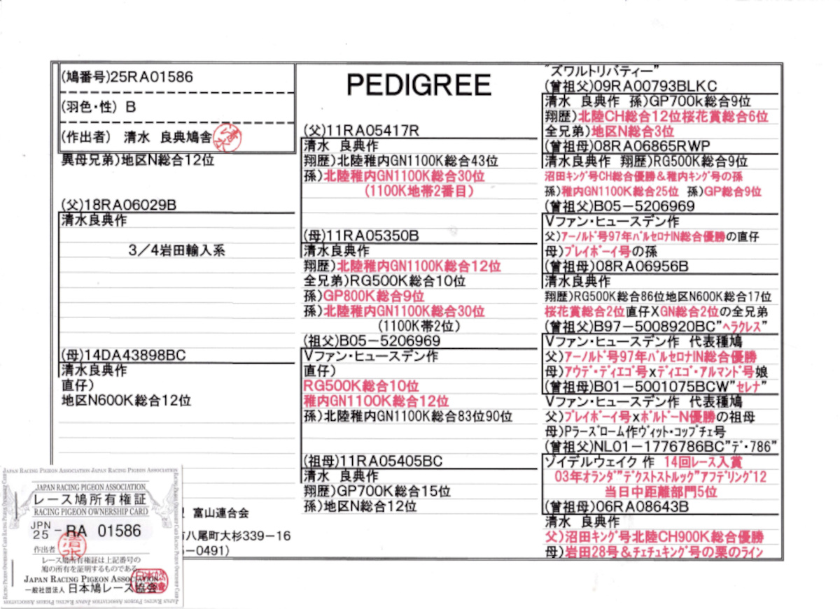 出品鳩若39番「25RA01586 B」清水良典作半兄弟)PN600K総合12位 岩田系(北陸GN1100K総合43位×稚内GN総合12位)×北陸GN総合12位異母兄弟 ![]() |