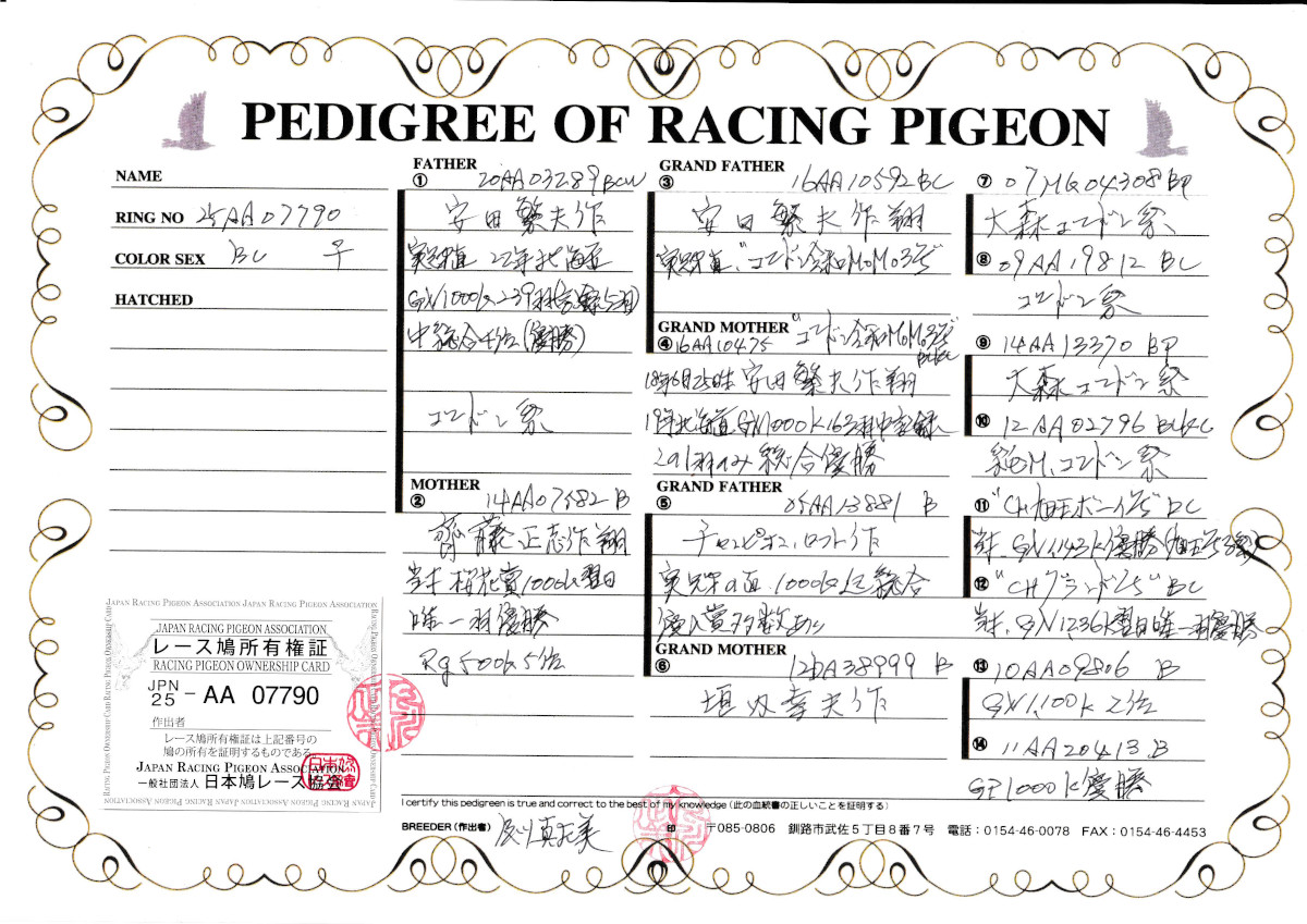 出品鳩27番「25AA07790 BC」チャンピオンロフト作 安田作ゴードン令和MOMO号19年北海道GN一羽帰り総合優勝鳩との親子掛け直仔×斎藤作翔 桜花賞1000K翌日一羽帰り優勝鳩 との直仔です。 父親 「20AA03289 BCP」安田繁夫鳩舎作 全兄弟の直仔に 22年北海道GN総合4位鳩がいる ゴードン令和MOMO号の父の兄弟×ゴードン令和MOMO号19年北海道GN一羽帰り総合優勝鳩との親子掛け直仔です。 母親 「14AA07582 B」斎藤正志鳩舎作翔 RG500K5位 桜花賞1000k翌日一羽帰り優勝鳩で (CH旭王ボーイ号GN優勝×CHグランド号GN優勝)直仔×(GN1100K2位×GP1000K優勝)娘鳩 との直仔です。 詳しくは、添付の血統書の参照をお願いいたします <備考> 現在管理人の鳩舎で元気に過ごしています。写真は4/23日に撮影しました。 菅原明鳩舎の概要はこちらをご覧ください |