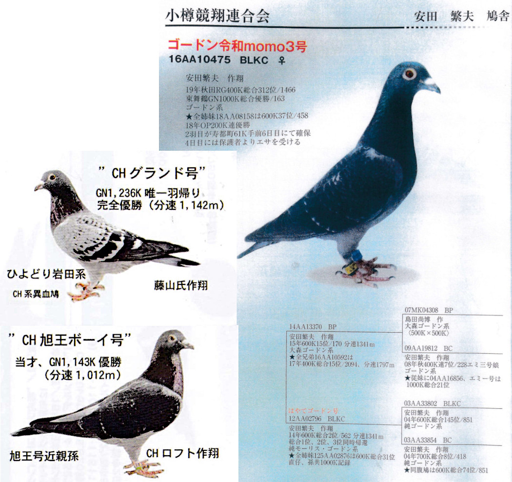 出品鳩27番「25AA07790 BC」チャンピォンL作ゴードン令和MOMO号北海道GN総合優勝鳩親子掛け直仔× 桜花賞1000K翌日一羽帰り優勝 ![]() |