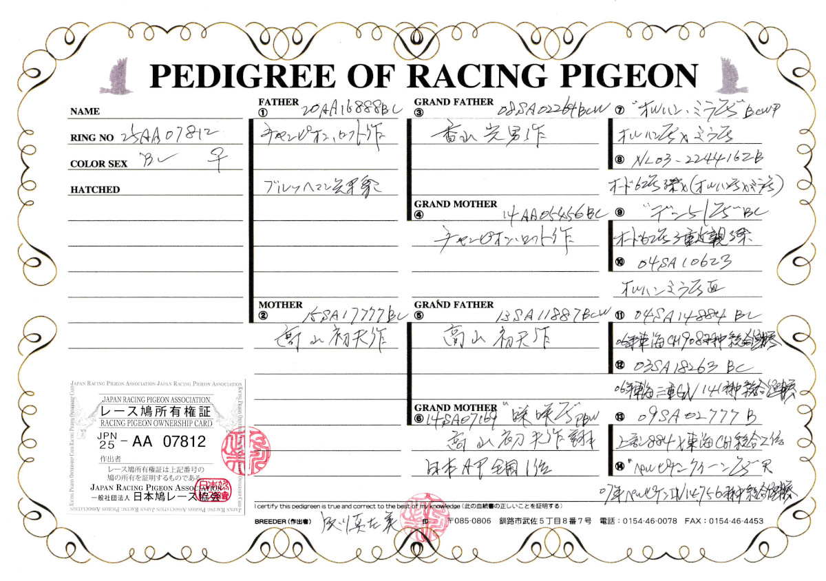 出品鳩28番「25AA07812 BC」チャンピオンL作香山作ブリュッヘマン系オルハンミラ号孫×高山作(東海CH&GN総合優勝直仔X咲咲号全日本AP賞全国1位) ![]() |