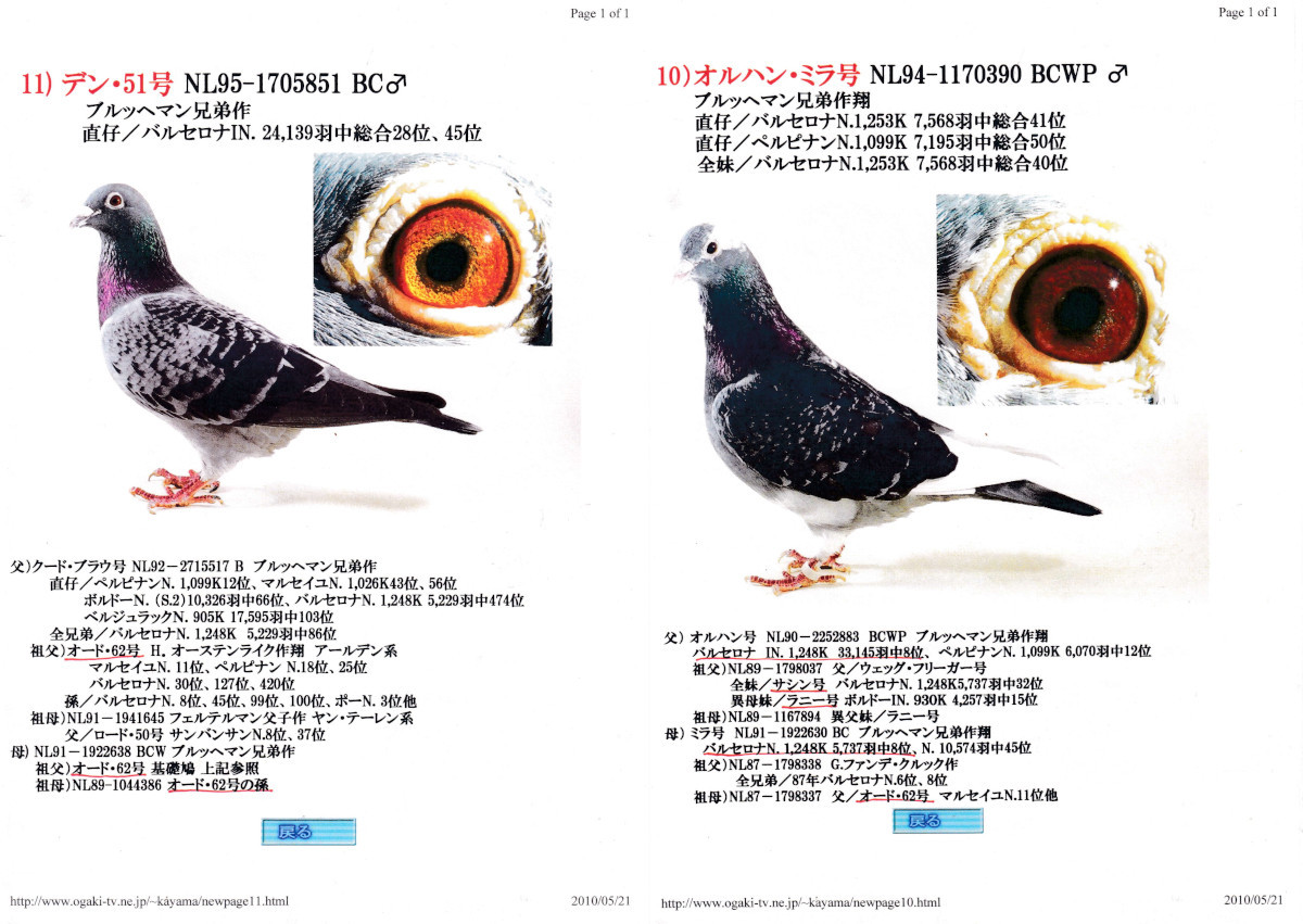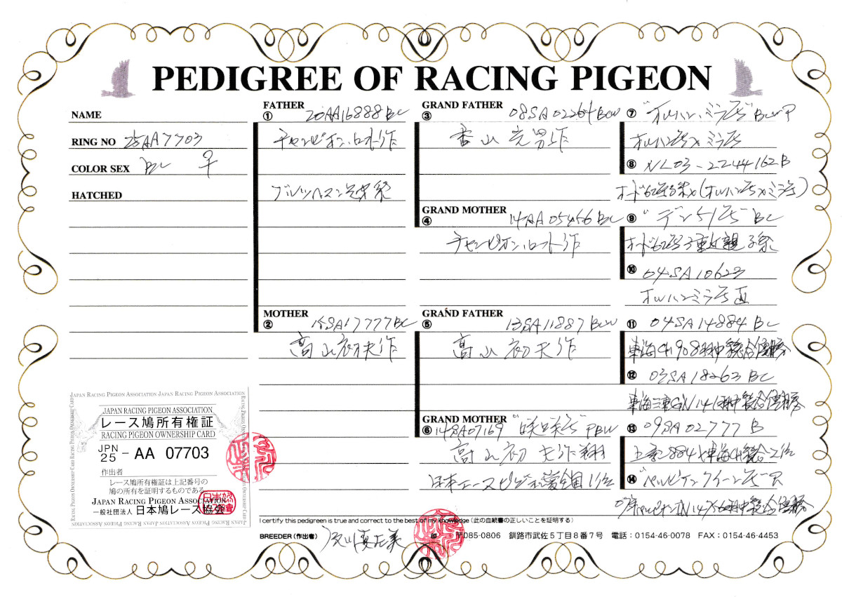 出品鳩21番「25AA07703 BC」チャンピオンL作香山作ブリュッヘマン系オルハンミラ号孫×高山作(東海CH&GN総合優勝直仔X咲咲号全日本AP賞全国1位) ![]() |