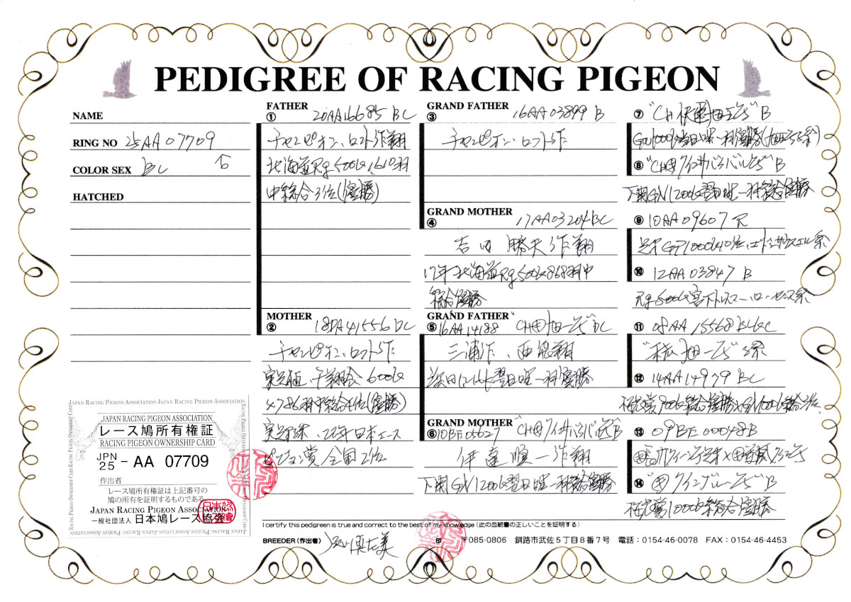 出品鳩4番「25AA07709 BC」チャンピオンL作 RG総合3位(CHクインサバイバル直仔×RG総合優勝)×(旭一号×クインサバイバル号) ![]() |