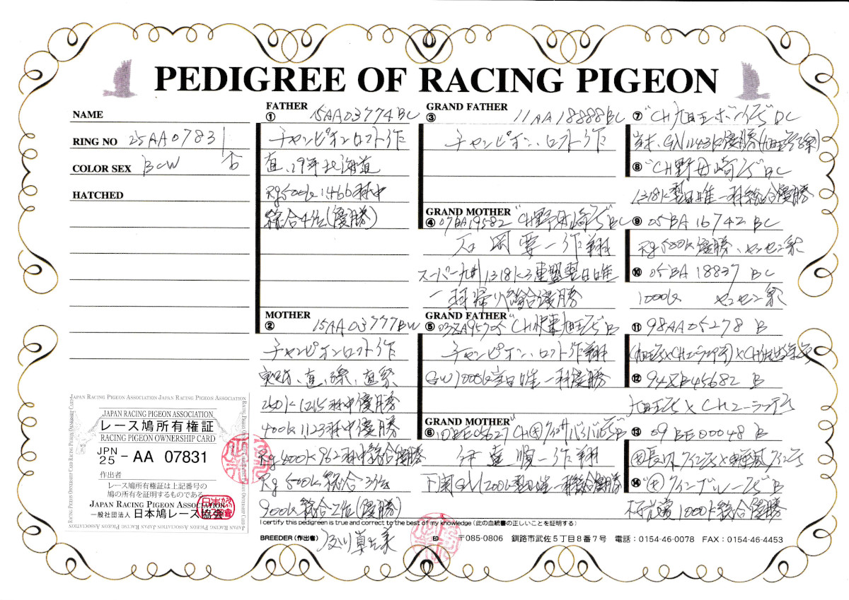 出品鳩16番「25AA07831 BCW」チャンピォンL作半兄弟RG総合4位 CH野母崎号スーパー九州1318K総合優勝親子掛け直仔×(CH快速旭王号×CH?クインサバイバル号) ![]() |