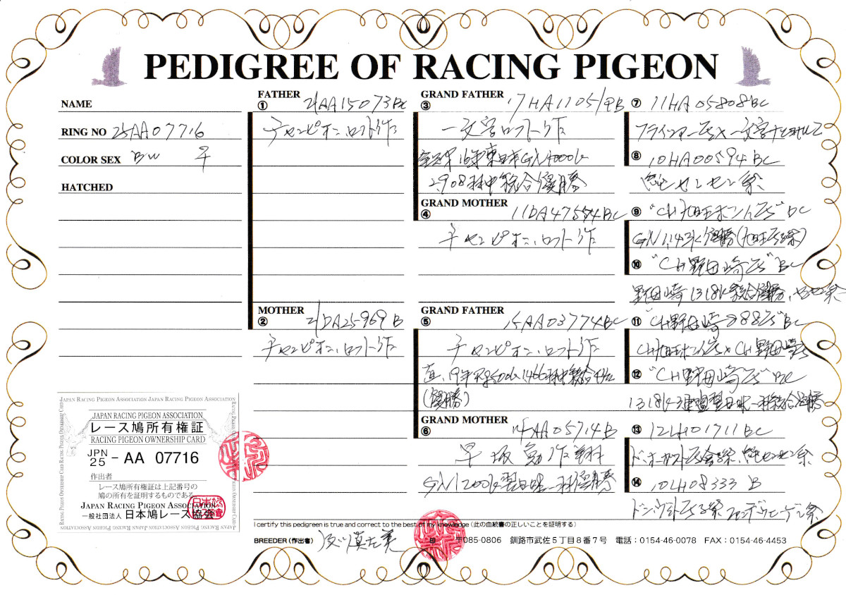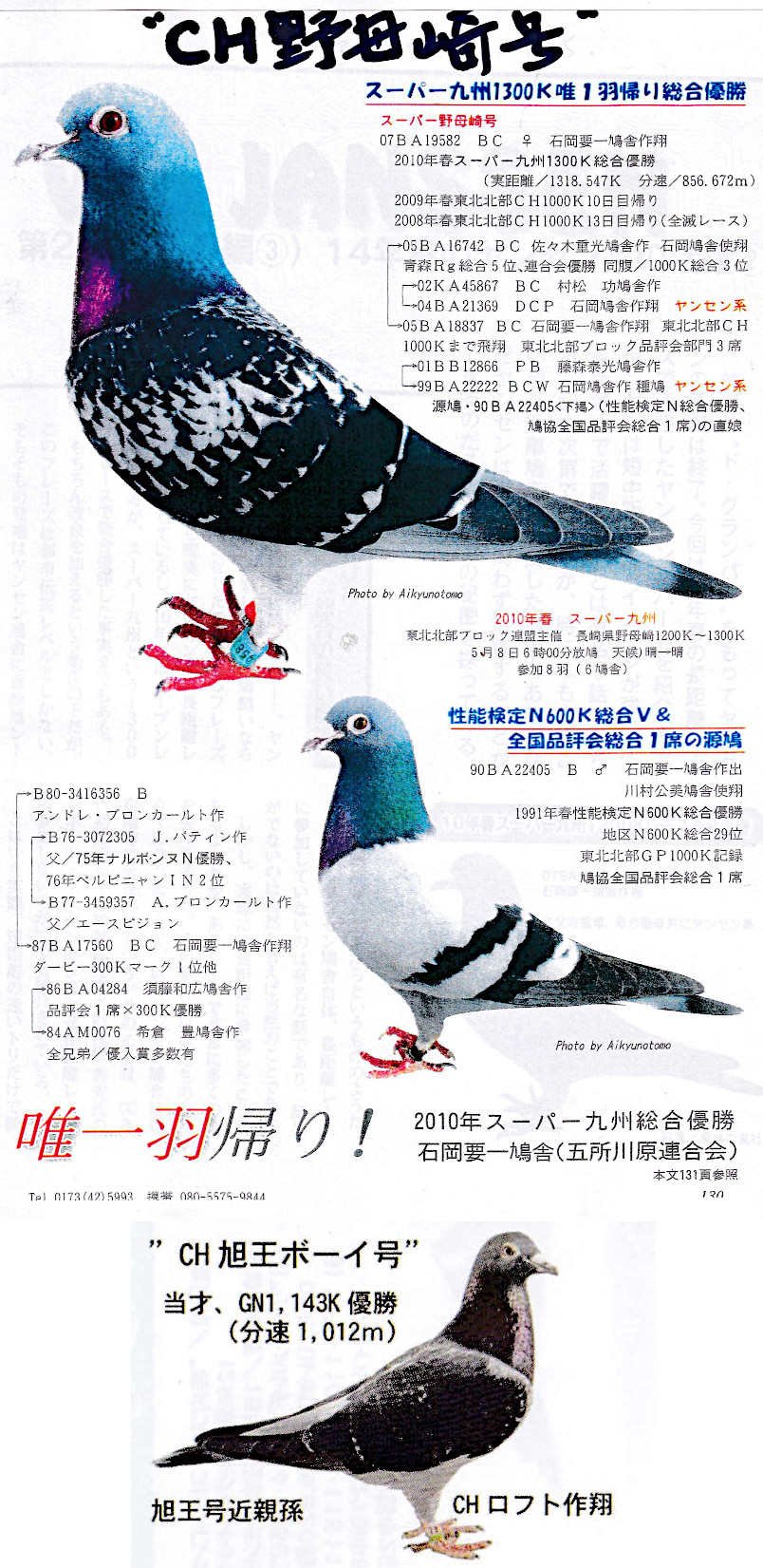 出品鳩「25AA07716 BW」チャンピオンロフト作(一文字作16年東日本GN2908羽総合優勝全兄弟×CH旭王ボーイ号&CH野母崎号娘)直仔×(CH野母崎号親子掛け直仔×北海道GN1200K翌日一羽帰り優勝)娘鳩 との直仔です。 父親 「21AA15073 BC」チャンピオンロフト作 一文字作16年東日本GN2908羽総合優勝全兄弟(フライツァー号孫)×(CH旭王ボーイ号GN1143K優勝XCH野母崎号スーパー九州1318K総合優勝)娘鳩 との直仔です。 母親「21DA25929 B」チャンピオンロフト作 異母兄弟にRG500K1466羽総合4位鳩がいる CH野母崎号スーパー九州1318K総合優勝鳩親子掛け直仔×北海道GN1200K翌日一羽帰り優勝鳩との直仔です。 詳しくは、添付の血統書の参照をお願いいたします。 <備考> 現在管理人の鳩舎で元気に過ごしています。写真は4/23日に撮影しました。 菅原明鳩舎の概要はこちらをご覧ください |