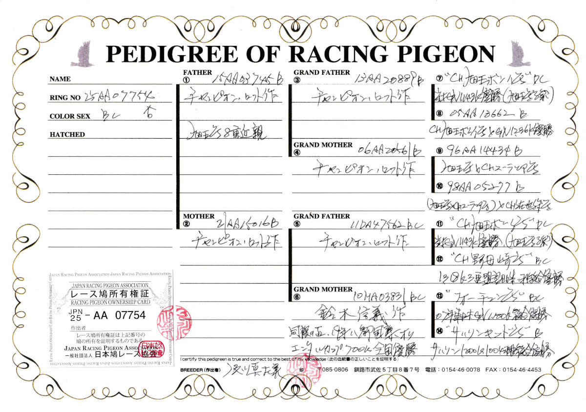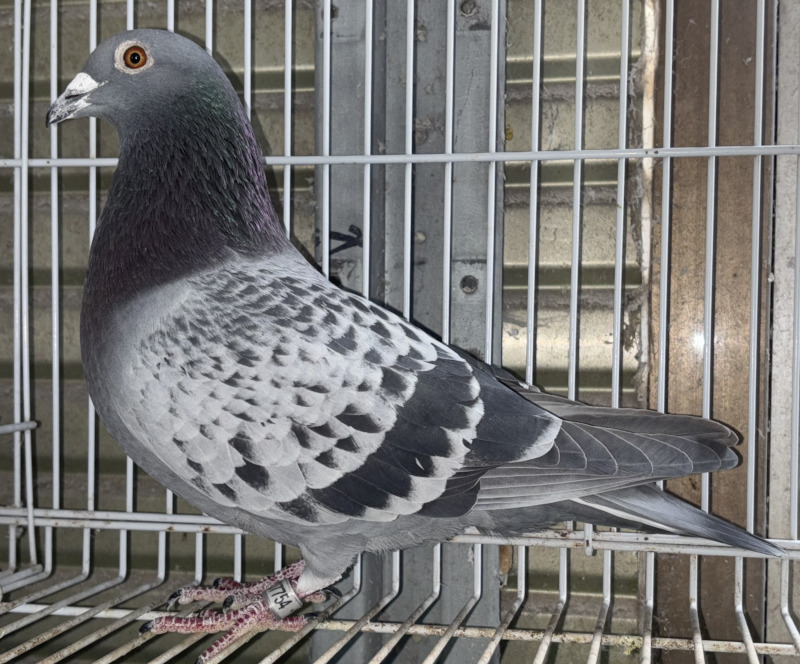 出品鳩6番「25AA07754 BC」チャンピオンロフト作 旭王号の8重近親(CH旭王ボーイ号当才GN1143K優勝の孫)×(CH旭王ボーイ号&CH野母崎号直仔×鈴木作フォーチュン号東日本GN総合優勝&サハリンキッド号サハリン1300K総合優勝の娘)娘鳩 との直仔です。 父親 「15AA03745 B」チャンピオンロフト作 旭王号の8重近親鳩で (CH旭王ボーイ号当才GN1143K優勝X旭王ボーイ号&GN1236の優勝の娘)直仔X旭王号&CHユーラシアユ号&CH佐世保号孫鳩 との直仔です。 母親 「21AA1501610 BC」チャンピオンロフト作(CH旭王ボーイ号当才GN1143K優勝×CH野母崎号スーパー九州1318K総合優勝)直仔×鈴木作(フォーチュン号東日本GN総合優勝×サハリンキッド号サハリン1300K総合優勝)娘鳩 との直仔です。 詳しくは、添付の血統書の参照をお願いいたします。 <備考> 現在管理人の鳩舎で元気に過ごしています。写真は4/23日に撮影しました。 菅原明鳩舎の概要はこちらをご覧ください |