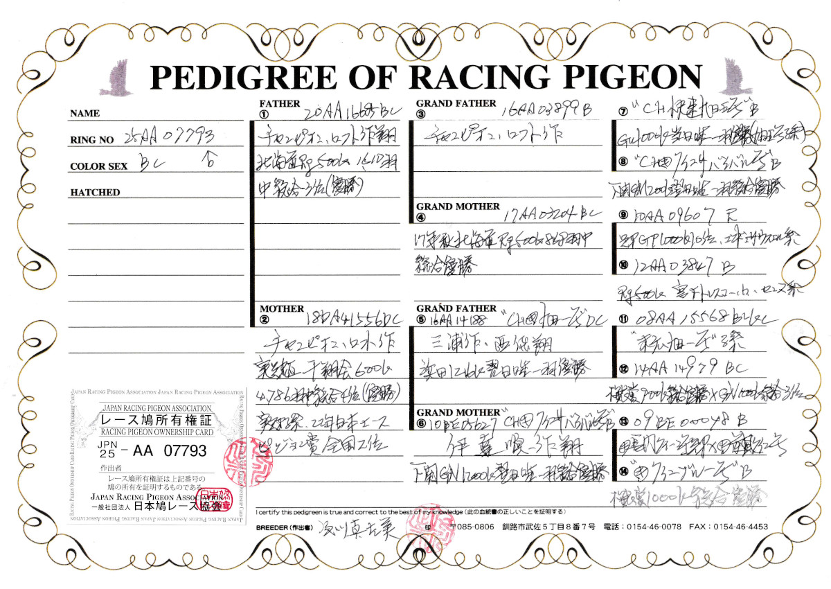 出品鳩12番「25AA07793 BC」チャンピオンL作 RG総合3位(CHクインサバイバル直仔×RG総合優勝)×(旭一号×クインサバイバル号) ![]() |