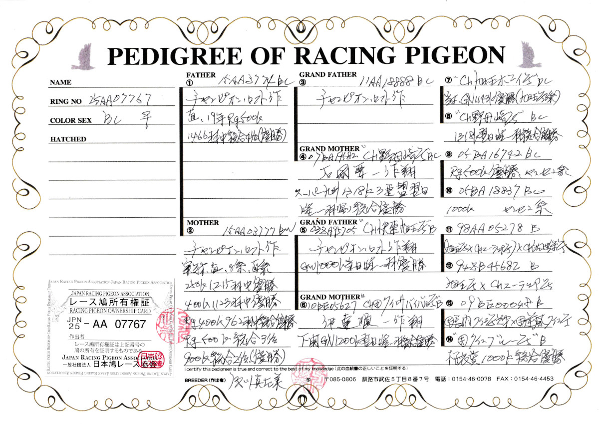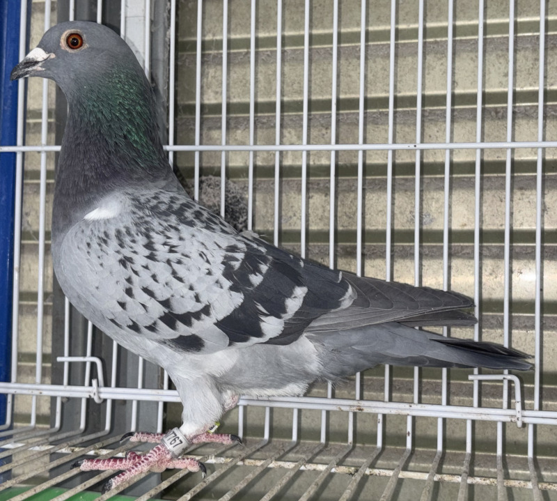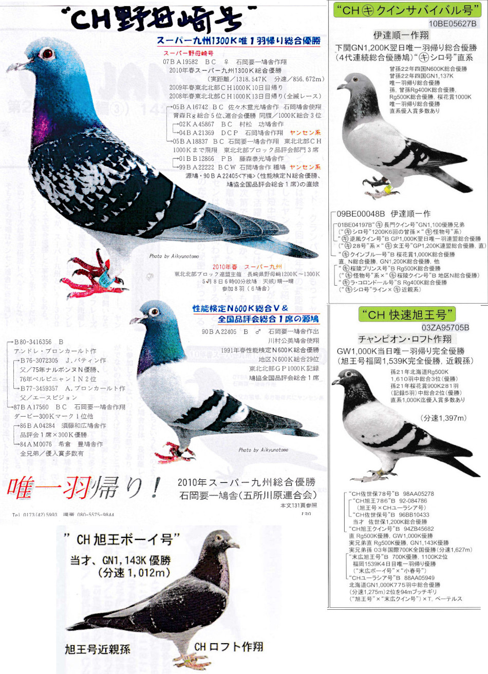 出品鳩26番「25AA07767 BC」チャンピォンL作半兄弟RG総合4位 CH野母崎号スーパー九州1318K総合優勝親子掛け直仔×(CH快速旭王号×CH?クインサバイバル号) ![]() |