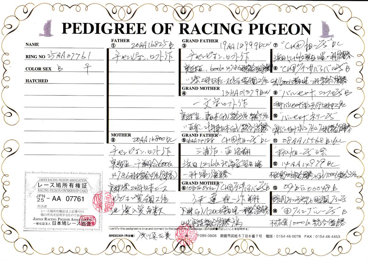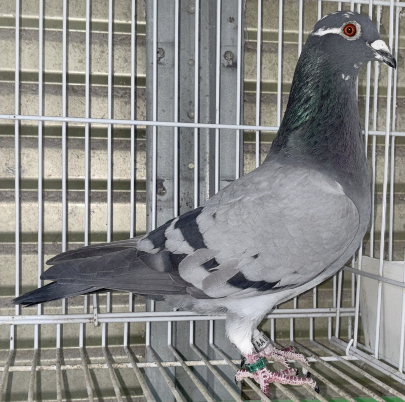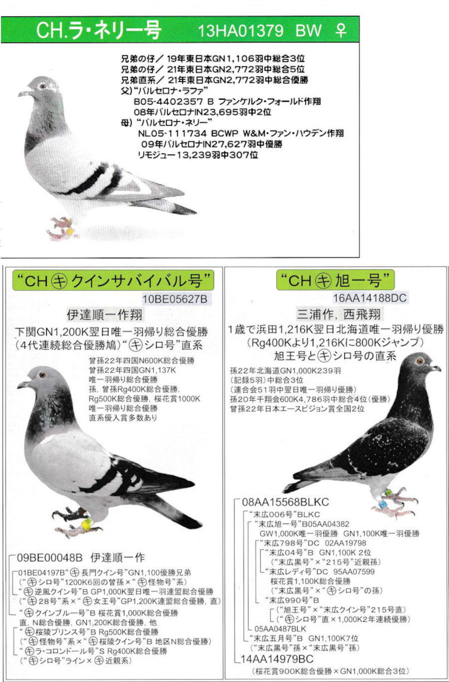 出品鳩25番「25AA07761 B」チャンピオンロフト作(CH旭一号&CHクインサバイバル号直仔×一文字作バルセロナラファ号&バルセロナネリー号娘鳩)直仔×(CH旭一号1216K翌日1羽帰り優勝×CHクインサバイバル号GN総合優勝)娘鳩 との直仔です。 父親 「20AA16825 B」チャンピオンロフト作(CH旭一号1216K優勝×CHクインサバイバル号GN1200K総合優勝)直仔X一文字作(バルセロナラファ号Xバルセロナネリー号)バルセロナIN総合優勝ペァー娘鳩 との直仔です。 母親 「19AA16800 DC」チャンピオンL作全兄弟の直仔に千翔会600K4786羽総合4位鳩がいる CH旭一号1216K翌日1羽帰り優勝×CHクインサバイバル号GN1200K総合優勝鳩 との直仔です。 詳しくは、添付の血統書の参照をお願いいたします。 <備考> 現在管理人の鳩舎で元気に過ごしています。写真は4/23日に撮影しました。 菅原明鳩舎の概要はこちらをご覧ください |