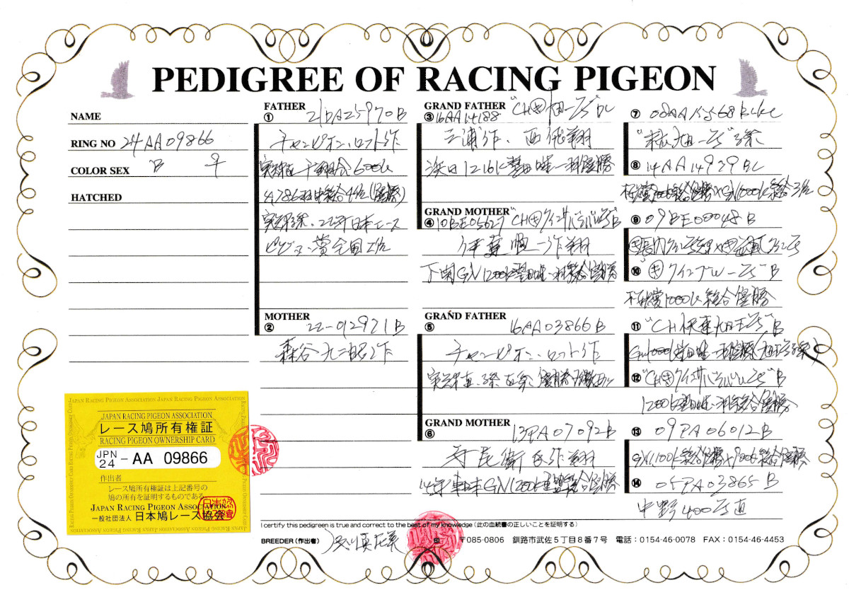 出品鳩20番「24AA09966 B ♀」チャンピオンロフト作(CH旭一号浜田1216翌日唯一羽帰り優勝鳩×CHクインサバイバル号下関GN1200k翌日唯一羽帰り総合優勝鳩)直仔×寺尾作東日本GN1200K連盟総合優勝(中野400号孫)娘鳩 との直仔です。 父親 「21AA25970 B」チャンピオンロフト作 全兄弟の直仔に千翔会600k4789羽総合4位鳩がいる CH旭一号浜田1216翌日唯一羽帰り優勝鳩×CHクインサバイバル号下関GN1200k翌日唯一羽帰り総合優勝鳩との直仔です。 母親 「22−012971 B」森谷久二昭鳩舎作 (CH快速旭王号GW1000K総合優勝×CHクインサバイバル号GN1200K総合優勝)直仔X寺尾作東日本GN1200K連盟総合優勝(中野400号孫)鳩 との直仔です。 詳しくは、添付の血統書の参照をお願いいたします <備考> 現在管理人の鳩舎で元気に過ごしています。写真は4/23日に撮影しました。 菅原明鳩舎の概要はこちらをご覧ください |