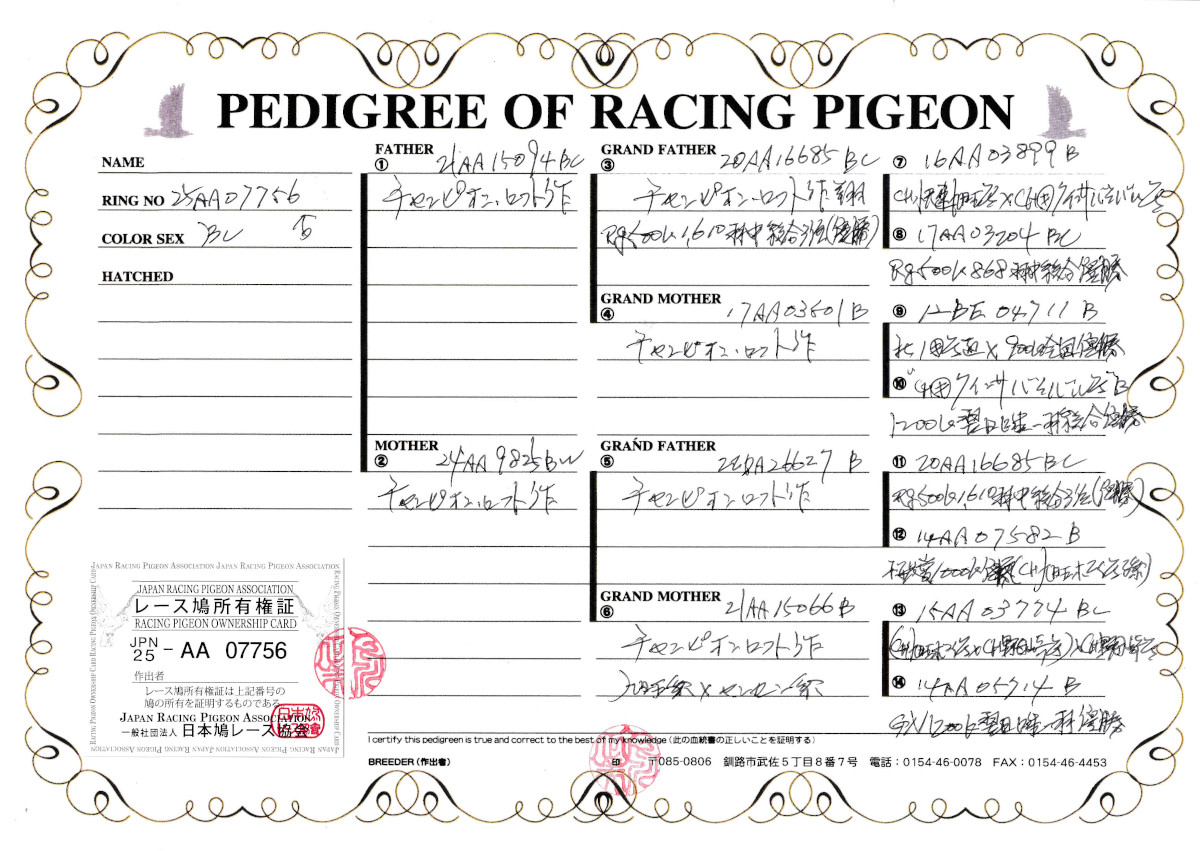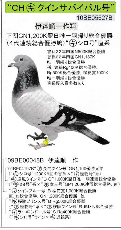出品鳩7番「25AA07756 BC」チャンピオンL作(RG総合3位×CHクィンサバイバル号娘)X(RG総合3位&桜花賞優勝直仔×GN1200K翌日1羽優勝の娘) ![]() |
