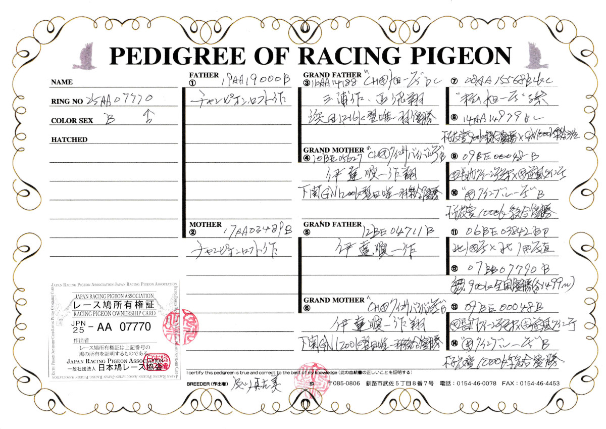 出品鳩9番「25AA07770 B」チャンピオンロフト作(CH旭一号1216K翌日1羽帰り優勝×CHクインサバイバル号GN総合優勝)直仔×CHクインサバイバル号下関GN1200k翌日唯一羽帰り総合優勝娘鳩 との直仔です。 父親 「19AA19000 B」チャンピオンL作 全兄弟の直仔に千翔会600K4786羽総合4位鳩がいる CH旭一号1216K翌日1羽帰り優勝×CHクインサバイバル号GN総合優勝鳩 との直仔です。 母親 「17AA03489 B」チャンピオンロフト作 両親伊達作 (北ノ号GP1000K総合優勝の親子掛け直仔×大渕作CH900K三地区総合優勝&09年衆議院議長賞全国優勝)直仔×CHクインサバイバル号下関GN1200k翌日唯一羽帰り総合優勝鳩 との直仔です。 詳しくは、添付の血統書の参照をお願いいたします。 <備考> 現在管理人の鳩舎で元気に過ごしています。写真は4/23日に撮影しました。 菅原明鳩舎の概要はこちらをご覧ください |
